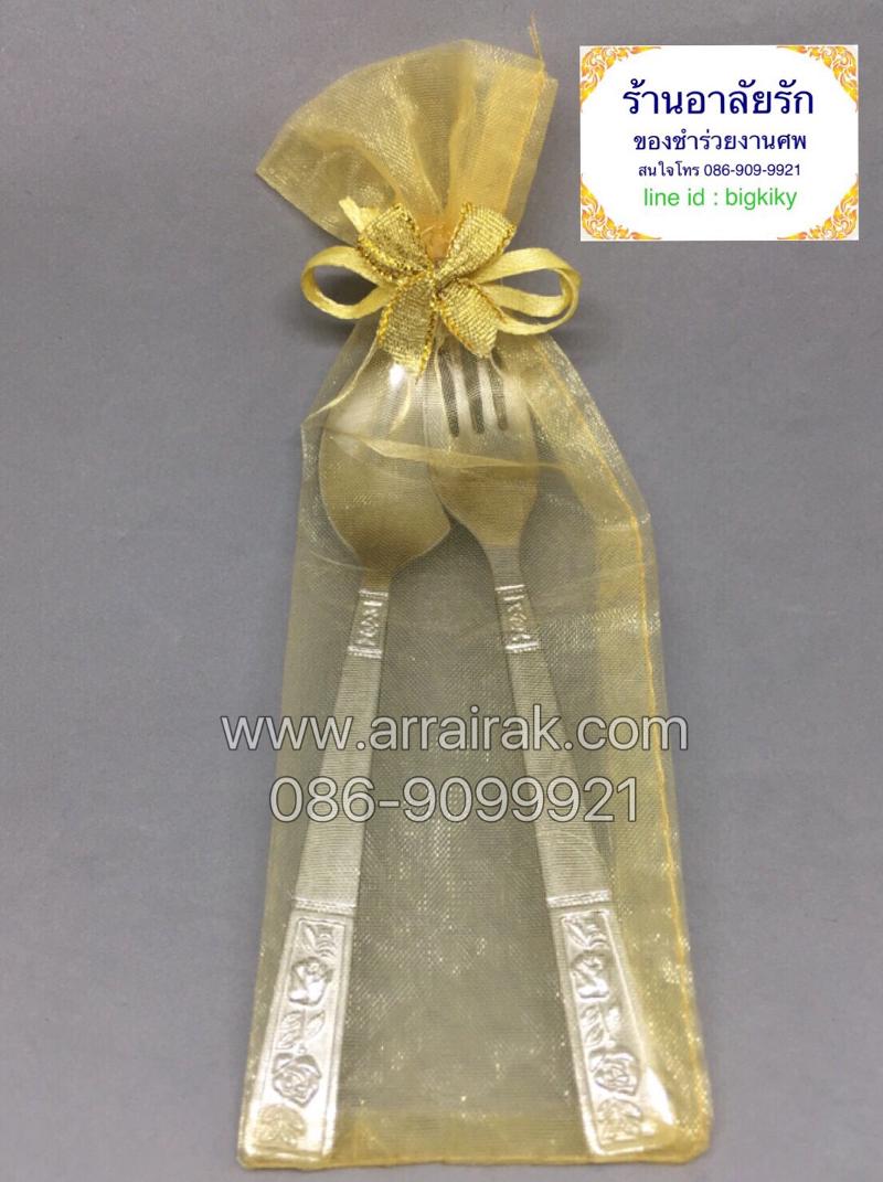 ช้อนส้อมชงกาแฟสแตนเลสอย่างดี ใส่ถุงผ้าทอง